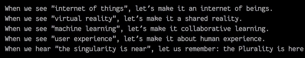 In addition, AI can augment our collective intelligence. For example, sorting through hundreds of thousands of input from citizens is very, very tedious. Now that we have a way for AI to power this conversation at scale, a hundred thousand people can listen to one another because the facilitation is in AI. The more people join, the better the quality.